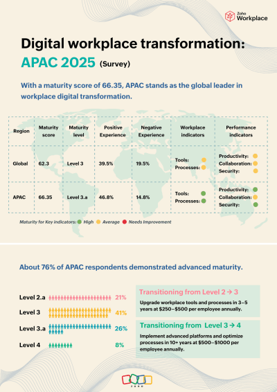 SINGAPORE – Media OutReach Newswire – 22 April 2025 – Zoho, the global technology company headquartered in Chennai, has released its global survey titled “Workplace Digital Transformation Survey 2025“. According to the survey, APAC is leading in several key areas, outperforming other regions in cybersecurity adoption, AI-powered workplace tools, and structured collaboration processes. The study, conducted by Zoho Workplace, the company’s enterprise email and collaboration suite, was conducted across multiple industries and organization sizes, also revealed that APAC’s digital workplace transformation maturity (score of 66.35%) overtakes that of developed nations and also the global average (62.3%). The study further highlights that APAC organizations have the highest adoption rates of multi-factor authentication (40%), cybersecurity awareness training (44%), and secure remote work policies (44%). Additionally, AI-enhanced search and knowledge retrieval has reached 54% adoption in APAC, significantly ahead of the global average of 28%.