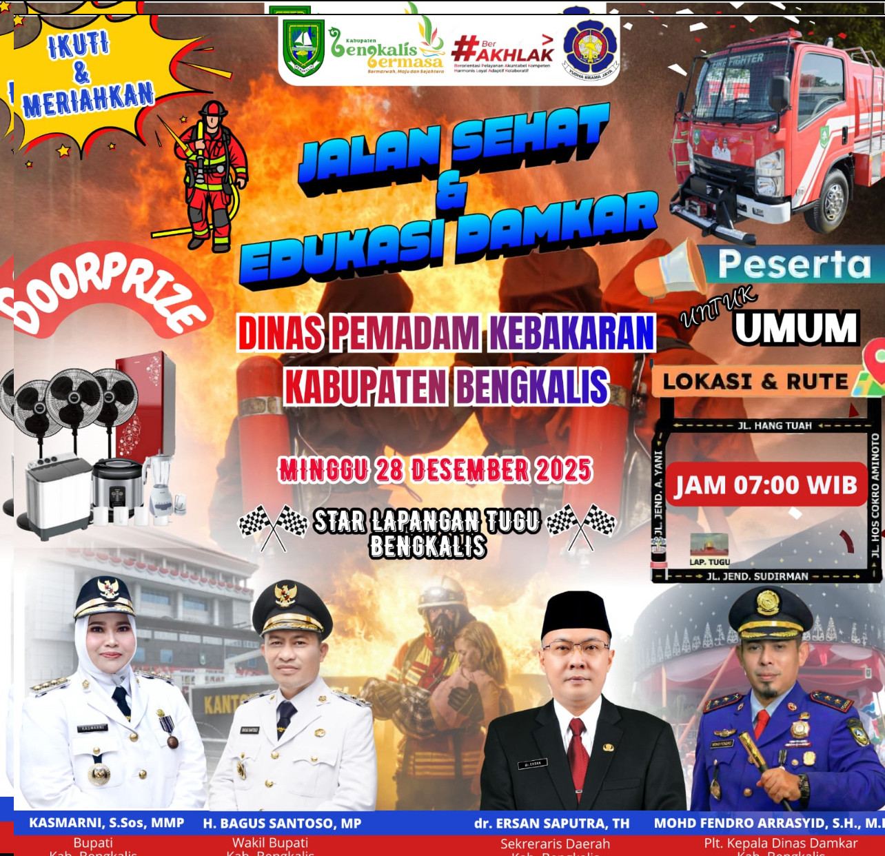 BENGKALIS – Dalam rangka meningkatkan kesadaran masyarakat terhadap pentingnya keselamatan kebakaran sekaligus mendorong penerapan pola hidup sehat, Dinas Pemadam Kebakaran Kabupaten Bengkalis akan menyelenggarakan kegiatan Jalan Sehat dan Edukasi Damkar pada Ahad, 28 Desember 2025.