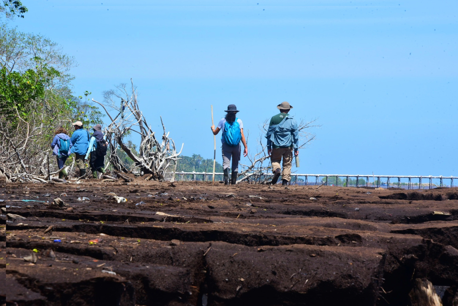 Lokasi pertama, rombongan menuju ke restorasi mangrove di Pantai Senekip, Desa Teluk Pambang. Tim menyisir pantai lebih kurang satu kilometer, berjalan kaki melewati lumpur dan batang-batang pohon hingga ke titik lokasi.