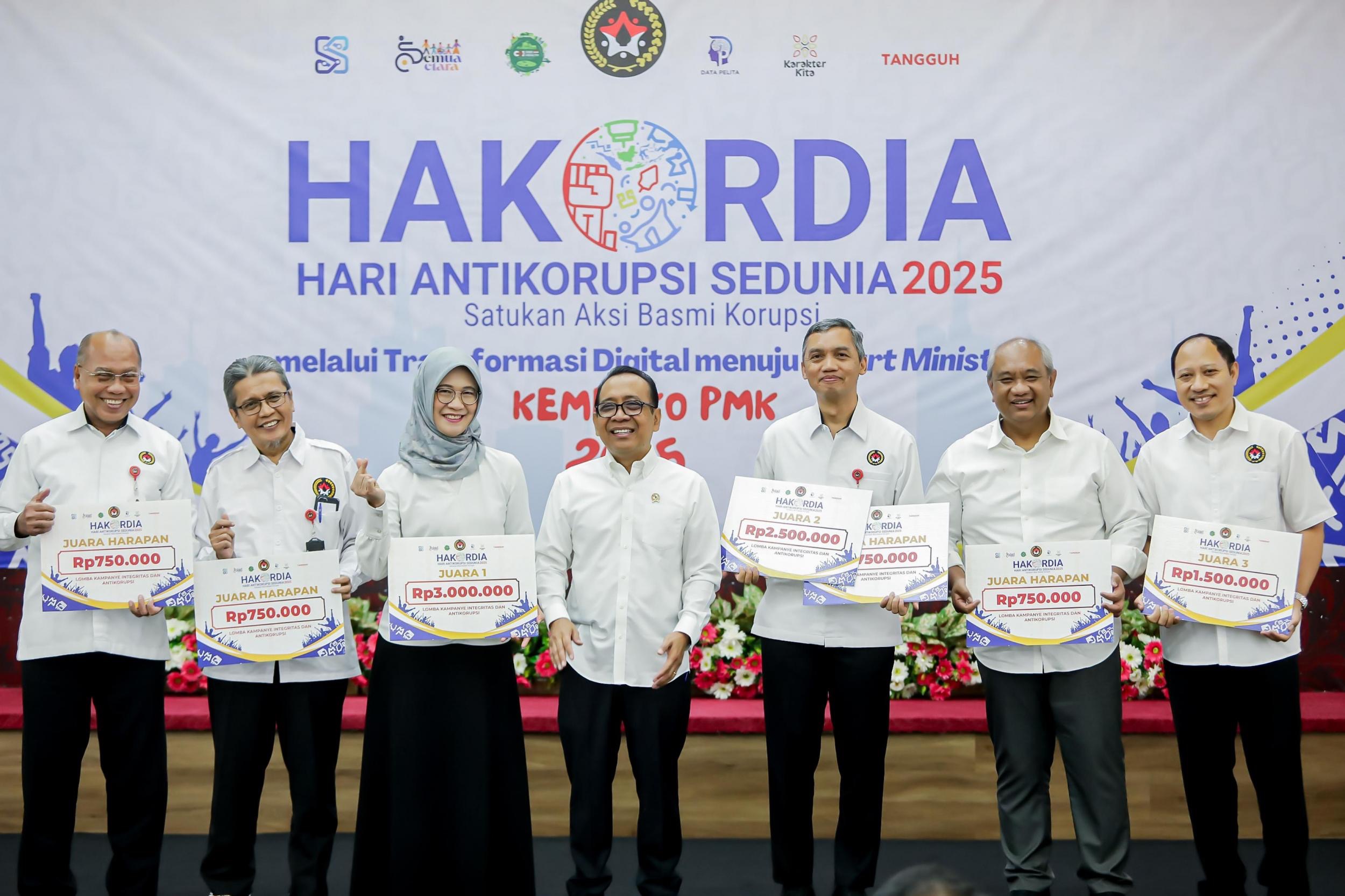 KEMENKO PMK — Kementerian Koordinator Bidang Pembangunan Manusia dan Kebudayaan (Kemenko PMK) menyelenggarakan peringatan Hari Antikorupsi Sedunia (HAKORDIA) 2025 dengan mengusung tema “Satukan Aksi, Bebas Korupsi Melalui Transformasi Digital Menuju Smart Ministry”, di Aula Heritage Kemenko PMK, Jakarta, pada Senin (15/12/2025).